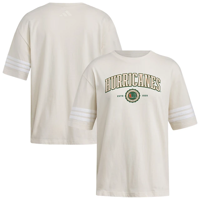 Women's adidas Cream Miami Hurricanes Fashion Three-Stripes Oversized T-Shirt