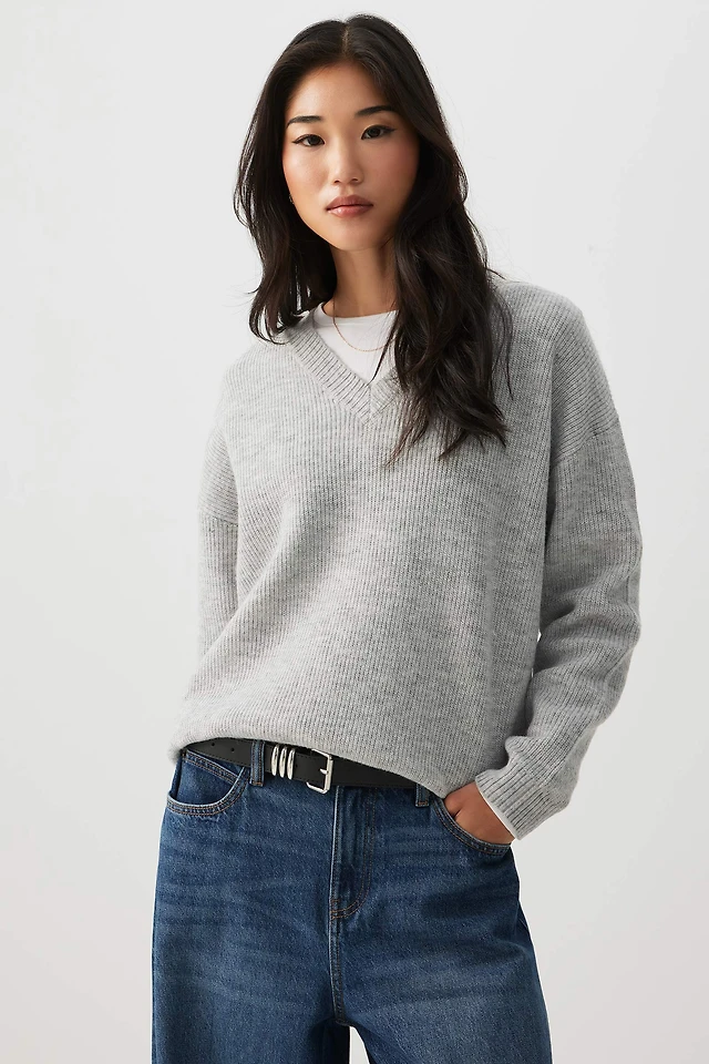 Ardene Rib V-Neck Sweater in Grey | Size Large | Polyester/Polyamide