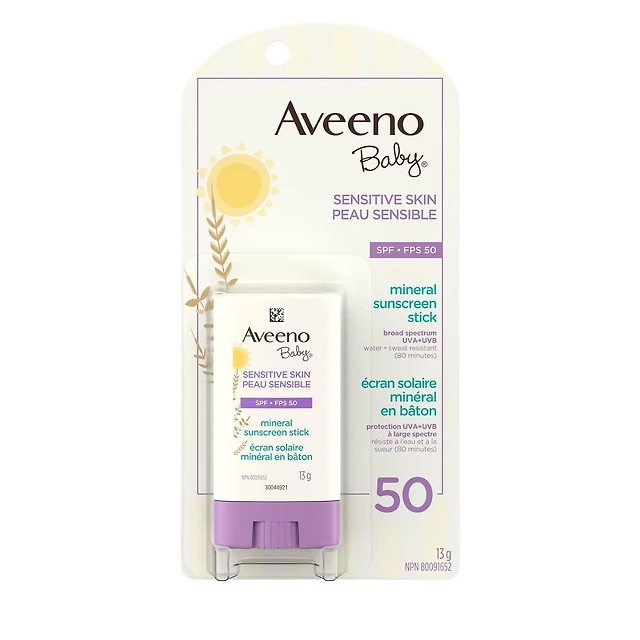 Aveeno Baby Sensitive Skin Mineral Sunscreen Stick SPF 50 with 100% Zinc Oxide, for Face & Body, Sweat- & Water-Resistant Kids Sunscreen Stick, Travel Size, 13 g