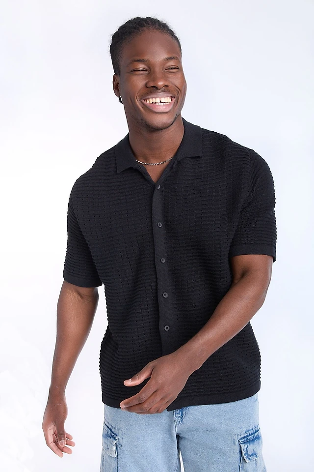 Cotton-Blend Button-Up Short Sleeve Textured Knit Shirt