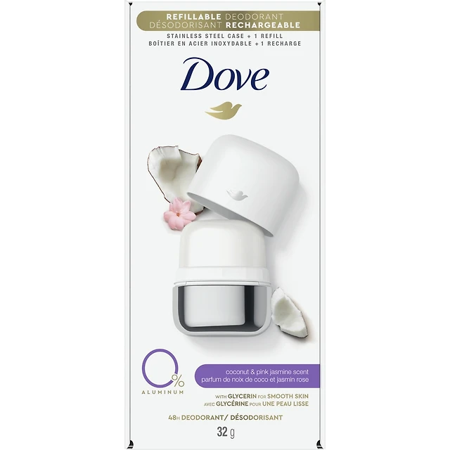 Dove 0% Aluminum Refillable Deodorant Starter Kit for 48 hour odour protection Coconut & Pink Jasmine aluminum-free deodorant for women 32g