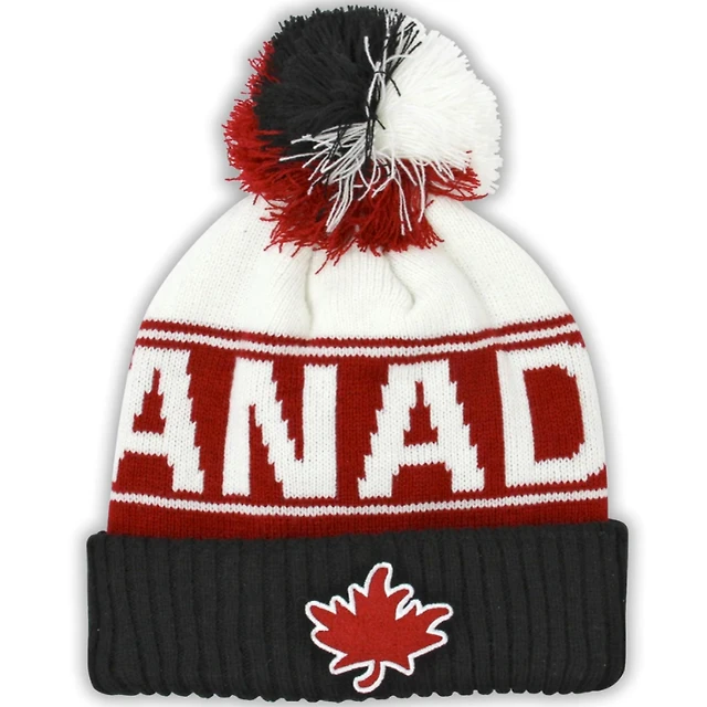 Cream Black and Red Athletic Maple Leaf Toque w/Pom-Pom