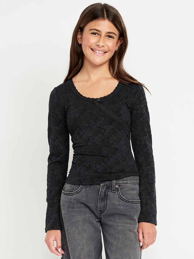 Fitted Long-Sleeve Lace-Tie Ribbed T-Shirt for Girls