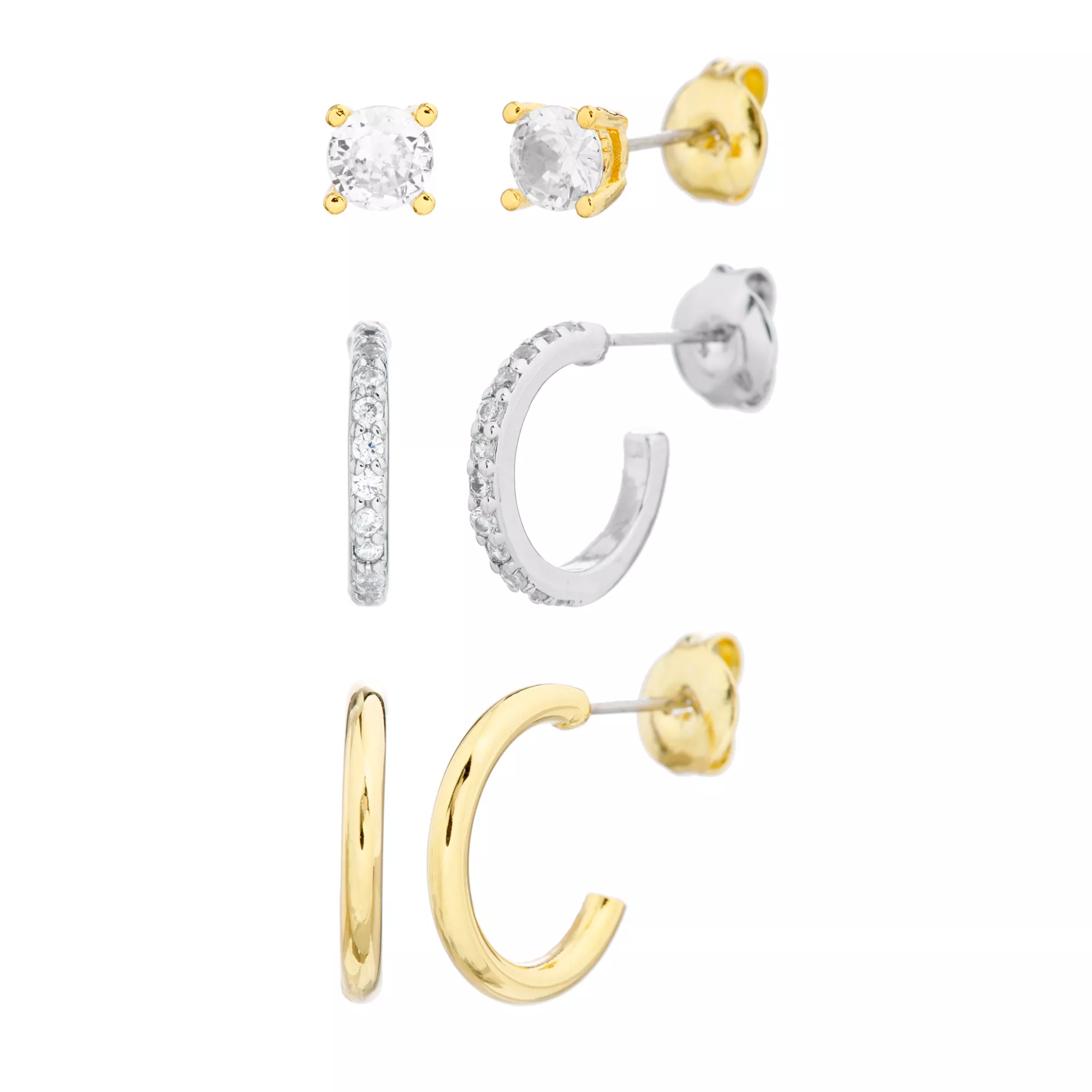Multi-Pack CZ Goldtone and Silvertone Stud and Hoop Earrings 3 Pair