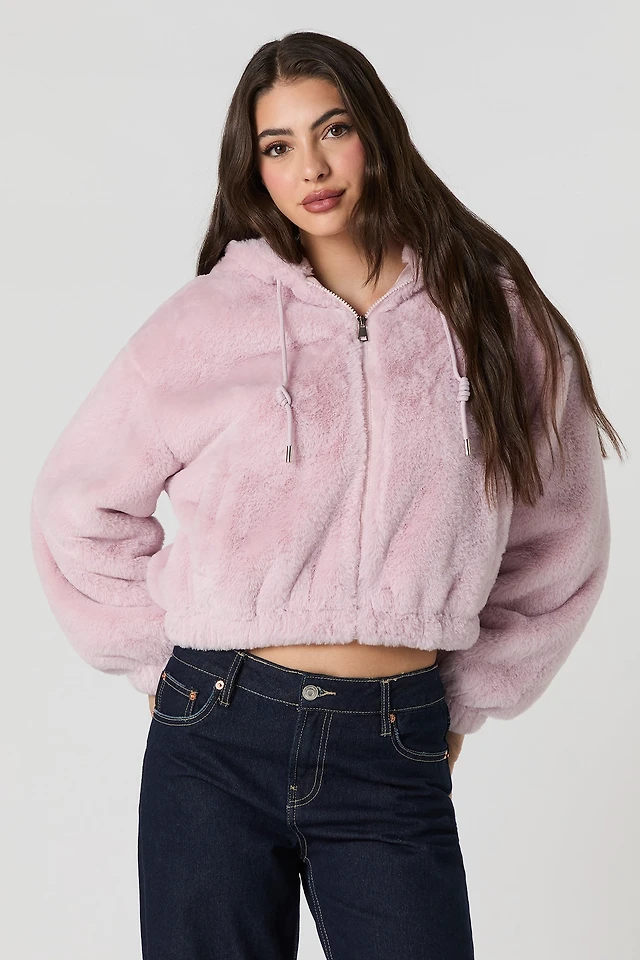 Faux-Fur Zip-Up Cropped Hooded Jacket