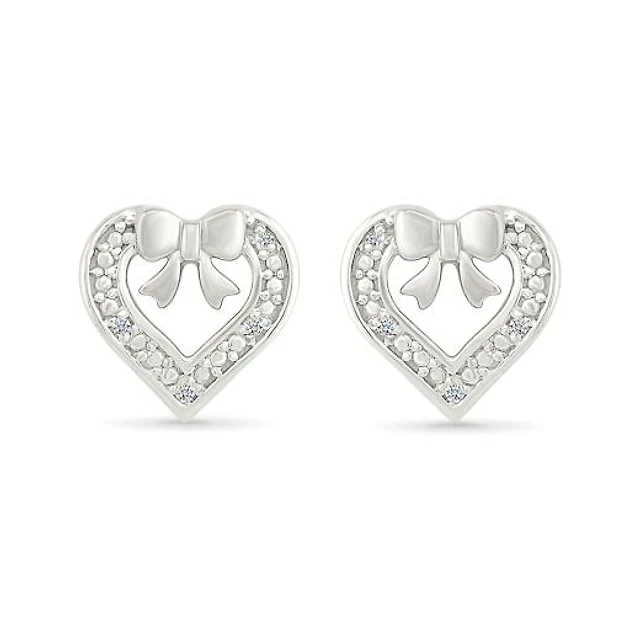 Diamond Heart & Bow Stud Earrings in Sterling Silver