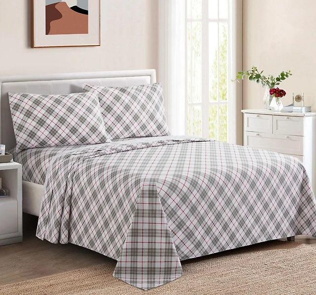 Marina Decoration Printed 600 Thread Count Soft Deep Pocket Hotel Standard Long Staple Cotton Blend Percale All Season Bedding Sheet Set, Grey White Tartan Pattern