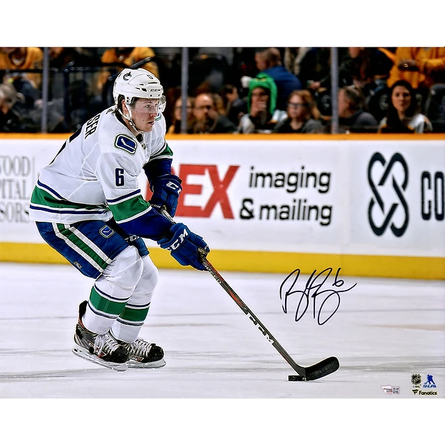 Brock Boeser Vancouver Canucks Autographed 16" x 20" White Jersey Skating with Puck Photograph