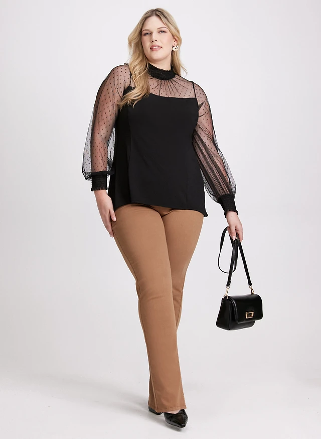 Dotted Mesh Mock Neck Top & Pull-On Straight Leg Jeans
