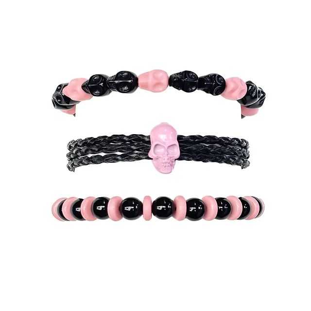 Multi-Pack Pink and Black Beaded Skull Bracelets - 3 Pack