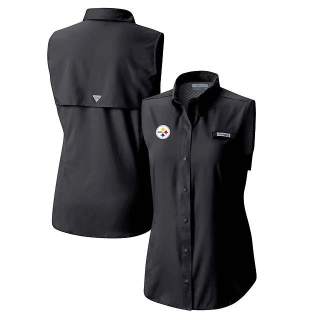 Men's Tommy Bahama Black Pittsburgh Steelers Coast Luminescent Fronds Camp IslandZone Button-Up Shirt
