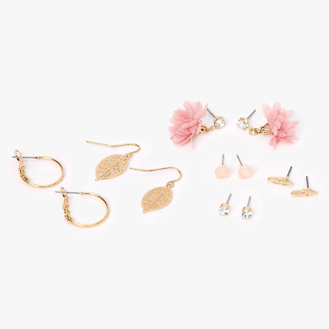 Pink Flower Gold-tone Leaf Mixed Earrings - 6 Pack