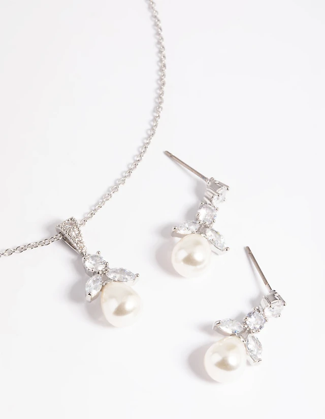 Silver Diamond Simulant Freshwater Pearl Necklace & Earrings Set