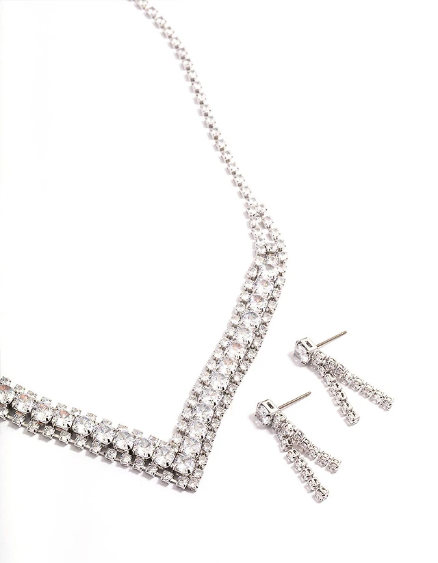 Diamond Simulant Silver Drop Earring & Necklace Set