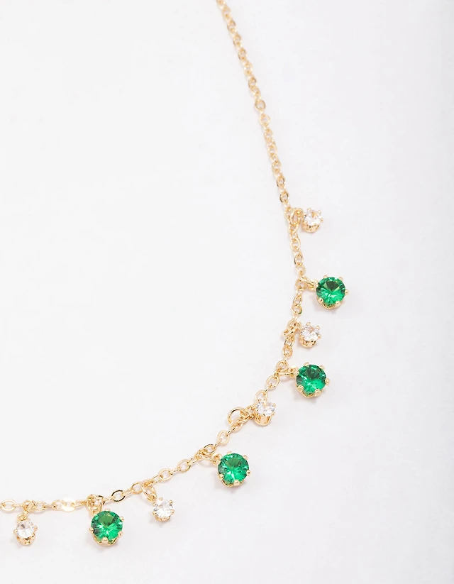 Gold Plated Emerald Cubic Zirconia Baguette & Droplets Layered Necklace