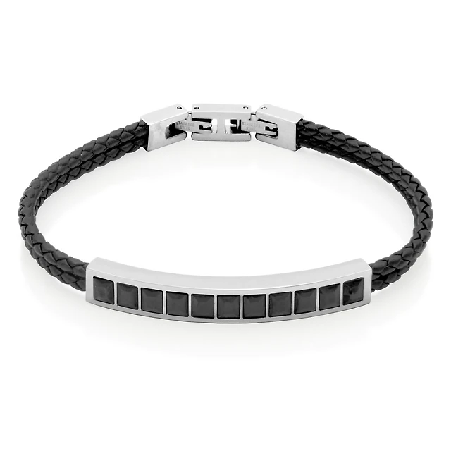SteelX Stainless Steel 8.25+0.5" Black Cubic Zirconia Leather Bracelet