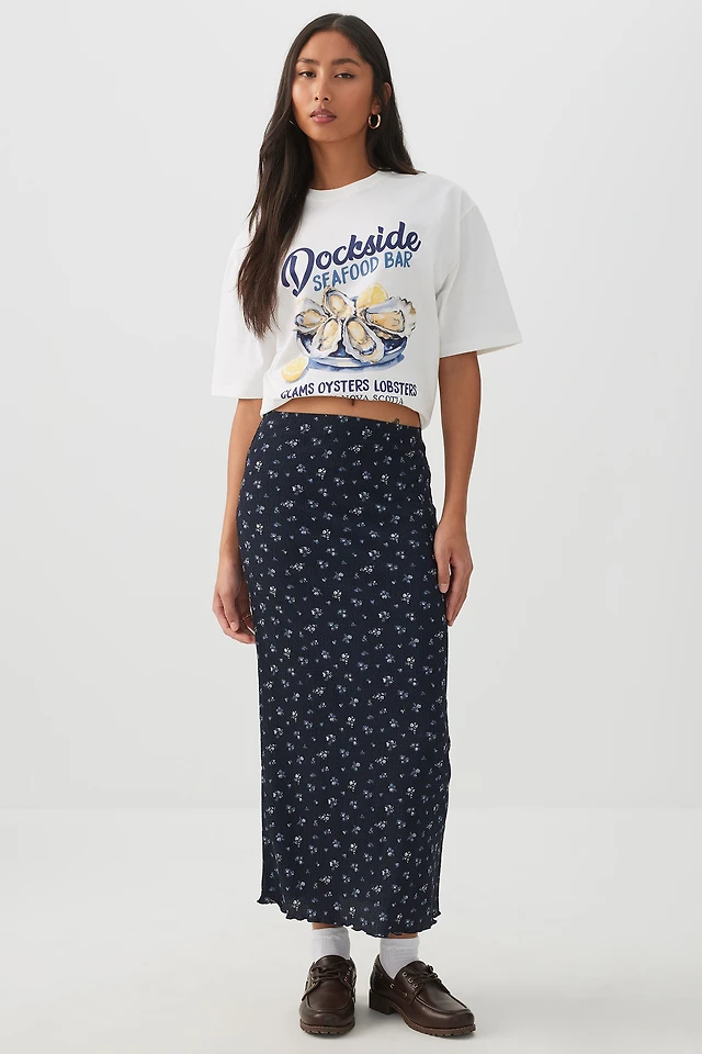 Ardene Floral Lettuce Hem Midi Skirt in Dark Blue | Size | Polyester/Spandex