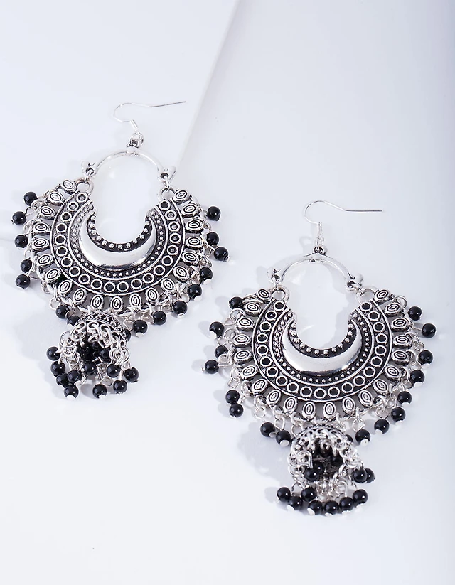 Gold & Black Beaded Half Disc Printed Drop Earrings