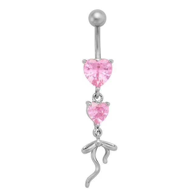 Double Pink CZ Heart and Bow Dangle Belly Ring - 14 Gauge