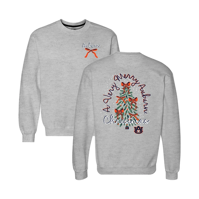Women's Heather Gray Auburn Tigers Classic Merry Christmas Tree Crewneck Sweatshirt