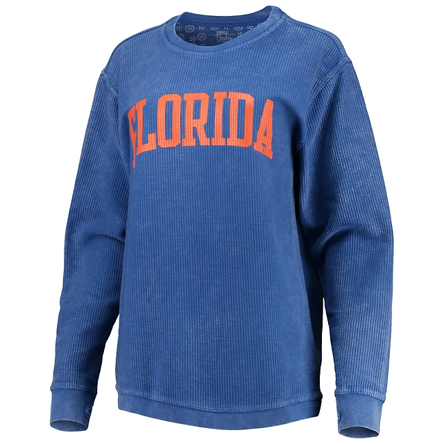 Women's Pressbox Royal Florida Gators Comfy Cord Vintage Wash Basic Arch Pullover Sweatshirt