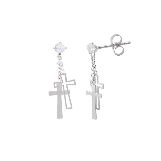 Clear CZ Double Cross Dangle Stud Earrings - 20 Gauge