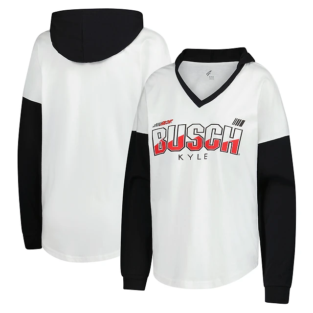 Women's G-III 4Her by Carl Banks White/Black Kyle Busch Bench Player Oversized Long Sleeve Hoodie V-Neck T-Shirt
