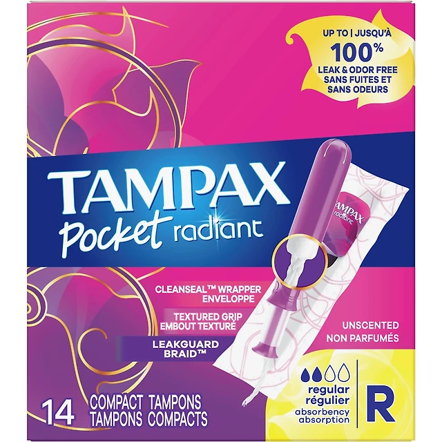 Pocket Radiant Compact Tampons Regular Absorbency with BPA-Free Plastic Applicator and LeakGuard Braid, Unscented