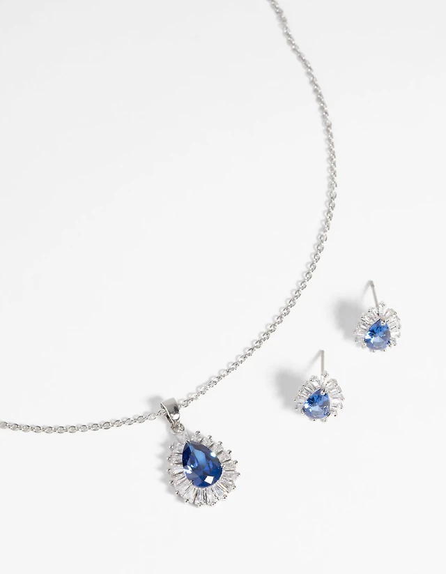 Silver Cubic Zirconia Sapphire Earring & Necklace Set