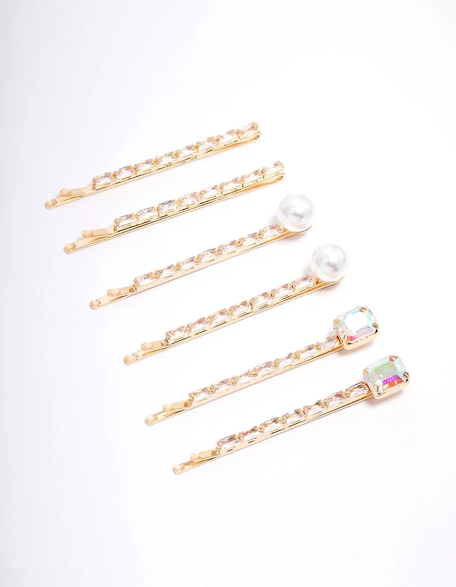 Gold Cubic Zirconia Baguette Freshwater Pearl Hair Clip
