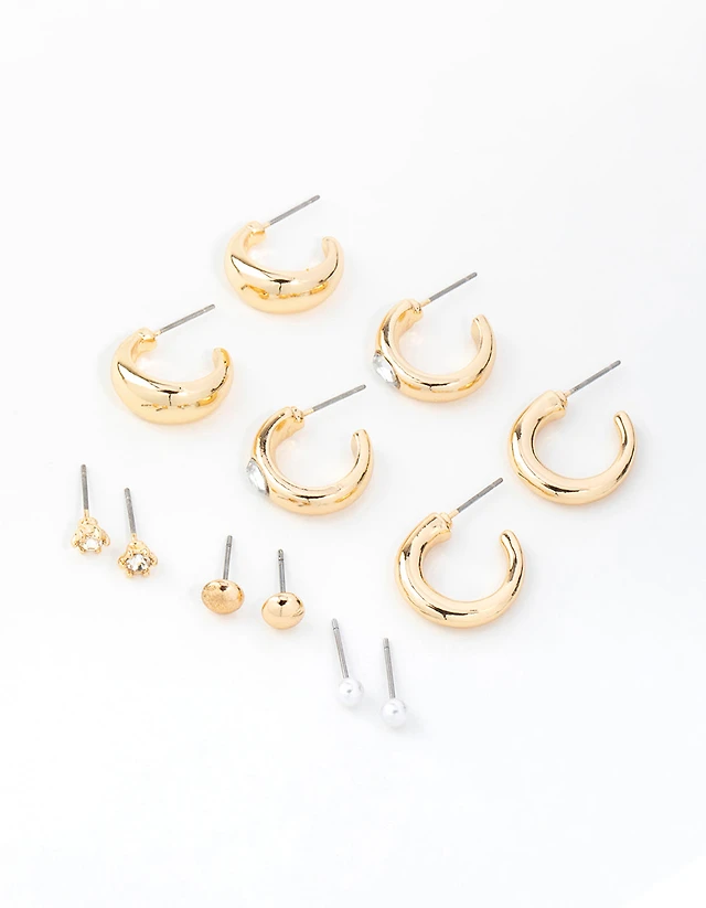 Gold Cubic Zirconia Cluster Hoop & Classic Stud Earrings 3-Pack