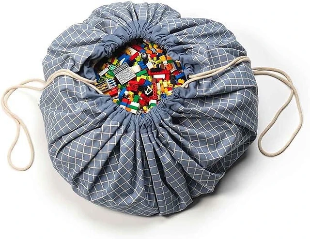 Play & Go - Timeless Blue Grid Pattern - 3-in-1 Play Mat - Storage Bag & Diaper Bag - Made from Organic Cotton - Easy Cleanup and Toy Storage - 120 cm Diameter - Suitable for Newborn to Toddler - Easy