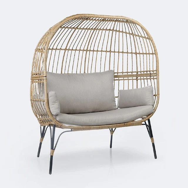 Halo Hanging Chair - Black Frame - Mixed Beige Wicker - Camel Cushions