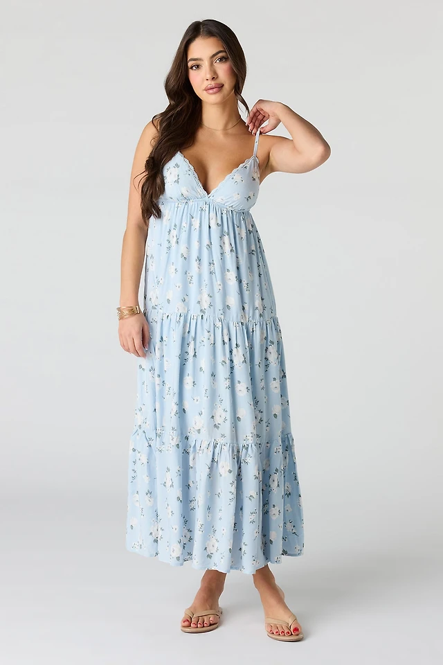 DV Sleeveless floral maxi dress with V-neck and a tiered ruffled hem