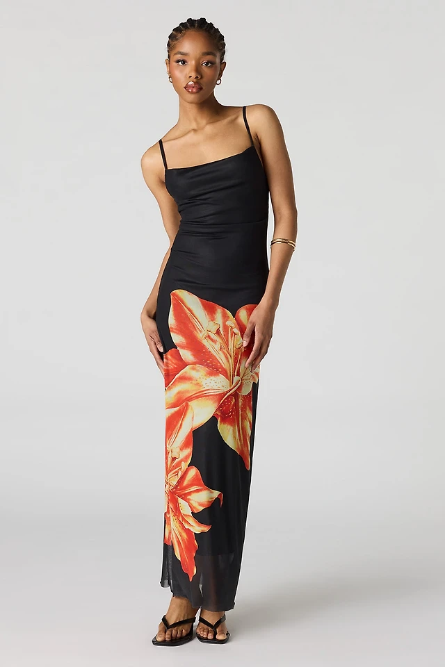 Mock Neck Printed Mesh Midi Dress