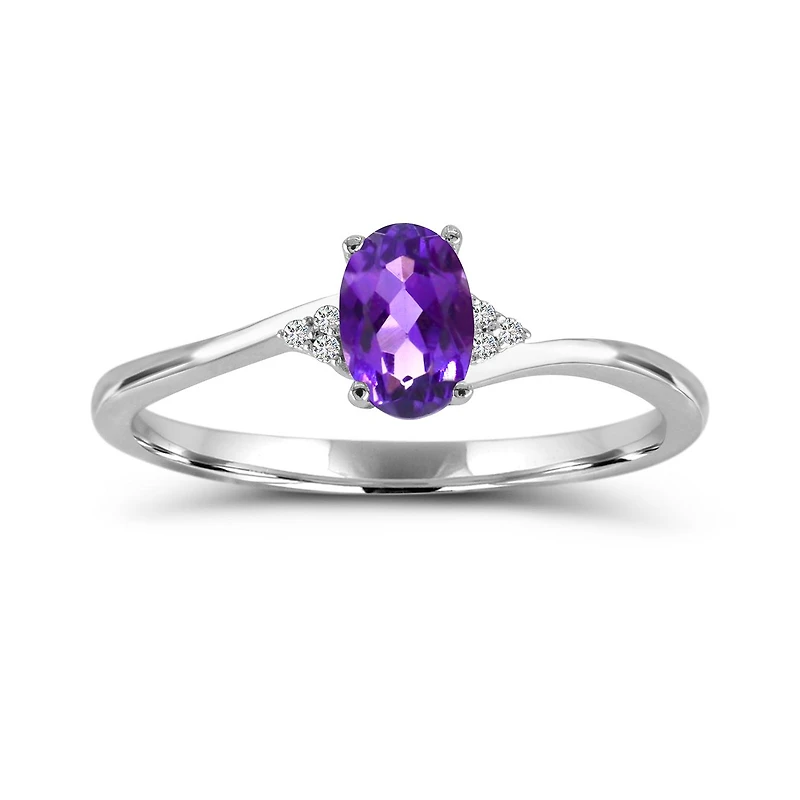 Gracefully understated yet irresistibly radiant, this 10K white gold ring features a mesmerizing amethyst centerpiece paired with a glint of diamonds. The delicate sparkle captures light with every movement, adding a subtle touch of glamour to any look. Perfect for everyday elegance or a quietly confident statement.
