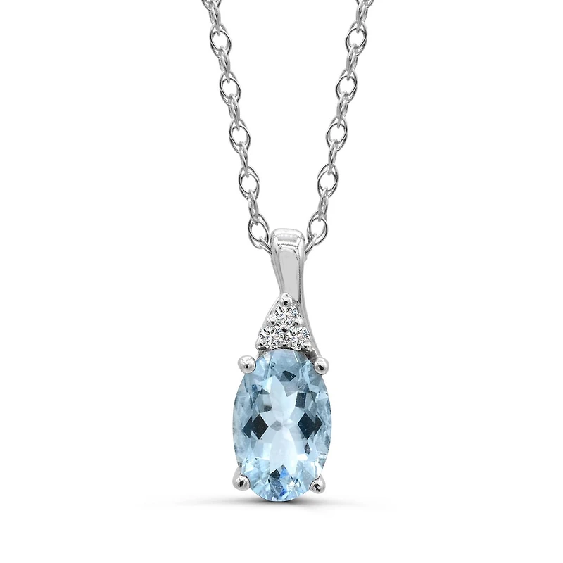 Refined and refreshing, this 18-inch pendant crafted from 10K white gold showcases a stunning aquamarine gem that evokes crisp blue skies and calm waters. A delicate sprinkle of diamond adds just enough sparkle to elevate any neckline with serene sophistication.