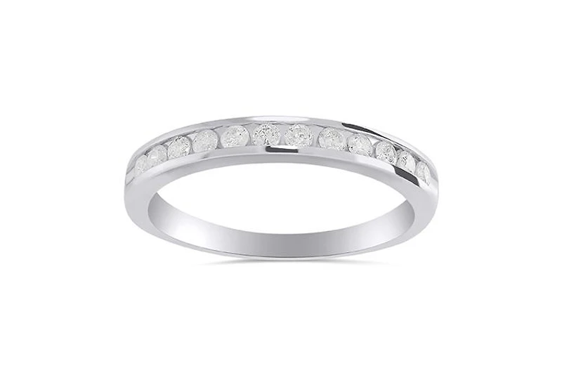 An elegant 10k white gold band lined with round diamonds is a beautiful statement of your love to one another.