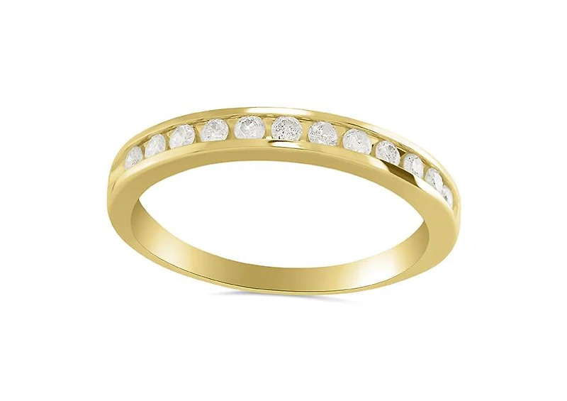 An elegant 10k yellow gold band lined with round diamonds is a beautiful statement of your love to one another.