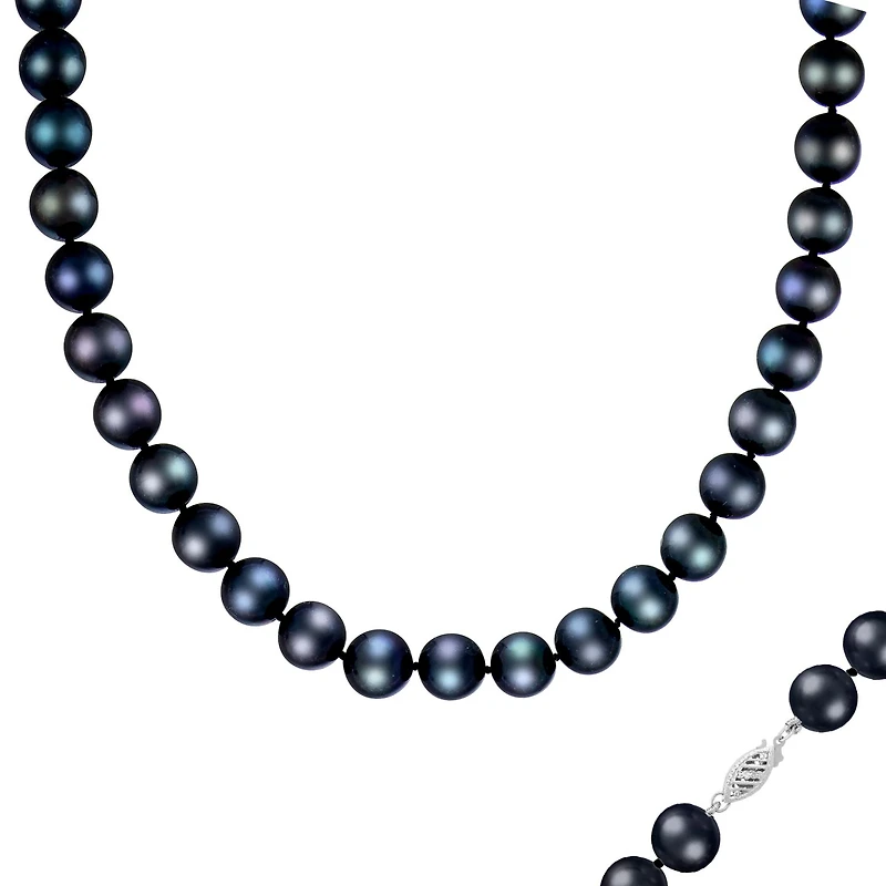 A 10mm black freshwater 18" pearl necklace, individually hand knotted with a 14k white gold filigree clasp