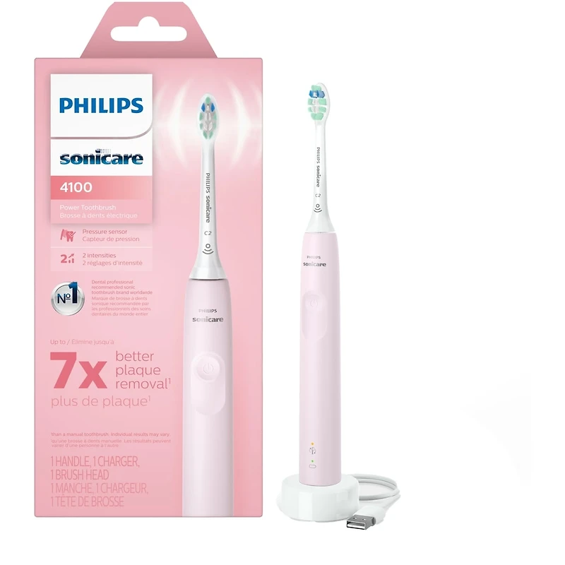 Remove plaque and experience a deep, effective clean with Sonicare technology, removing up to 5x more plaque vs. a manual toothbrush. Sonicare technology gently pulses water between your teeth, for a month's worth of manual brushing in just 2 minutes. The QuadPacer lets you know when you've spent the optimal amount of time on each section of your mouth while the SmarTimer signals when your 2 minutes is up. The pressure sensor flashes red to remind you to ease off, helping to prevent gum recession, while the 2 intensity settings ensure a comfortable clean that’s right for you. Going electric might feel like a big step, but with this brush you’re in safe hands. Its slim ergonomic design and familiar-shaped head gives you everything you need for an effective clean. The kit includes 1 Philips Sonicare 4100 electric toothbrush, 1 Optimal Plaque Control (C2) brush head and 1 charger.