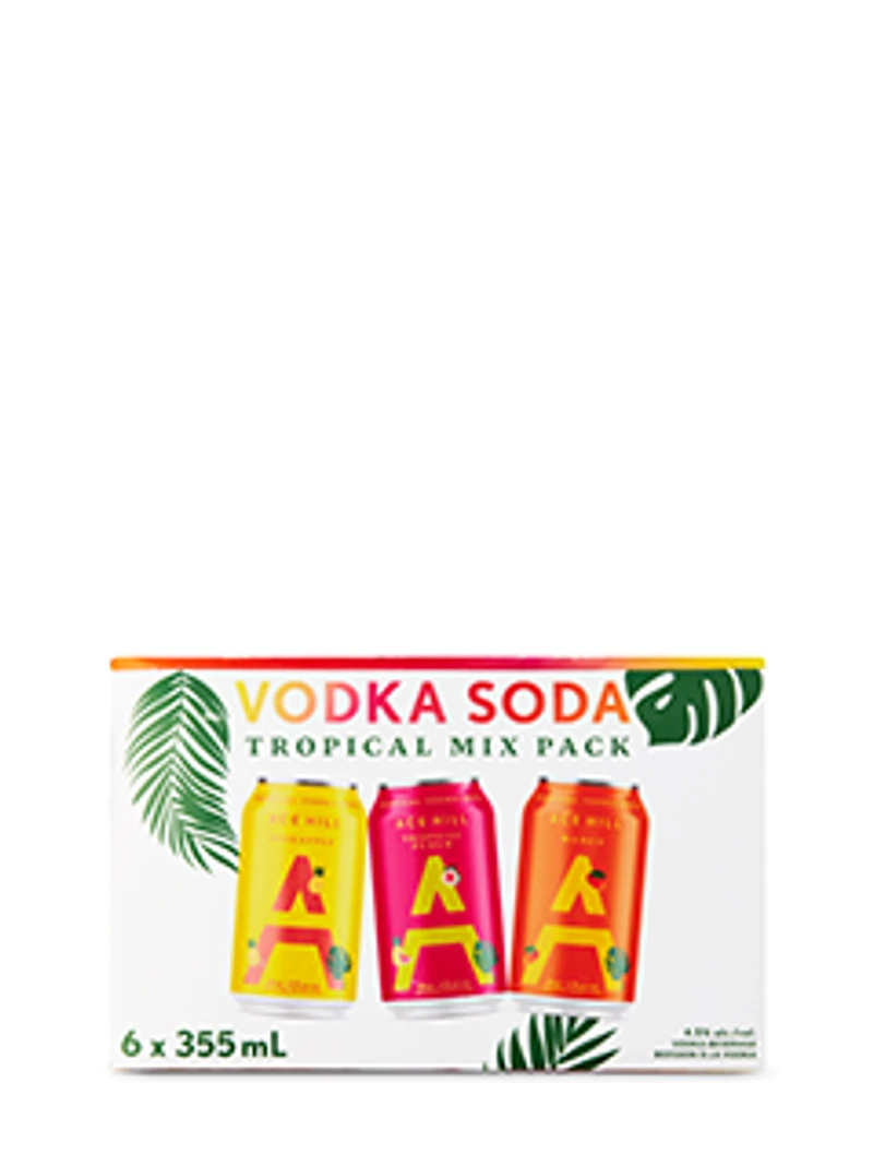 Ace Hill's Tropical Mix Pack features three new Vodka Soda flavours, available exclusively in this variety six-pack. Explore exciting flavours like Tropical Mango, Tropical Pineapple and Tropical Punch, all made with a splash of real fruit juice and only 100 calories per can. Pair with summer salads or roasted vegetables. Ace Hill's Tropical Mix Pack features three new Vodka Soda flavours, available exclusively in this variety six-pack. Explore exciting flavours like Tropical Mango, Tropical Pineapple and Tropical Punch, all made with a splash of real fruit juice and only 100 calories per can. Pair with summer salads or roasted vegetables. 6 x 355 mL can