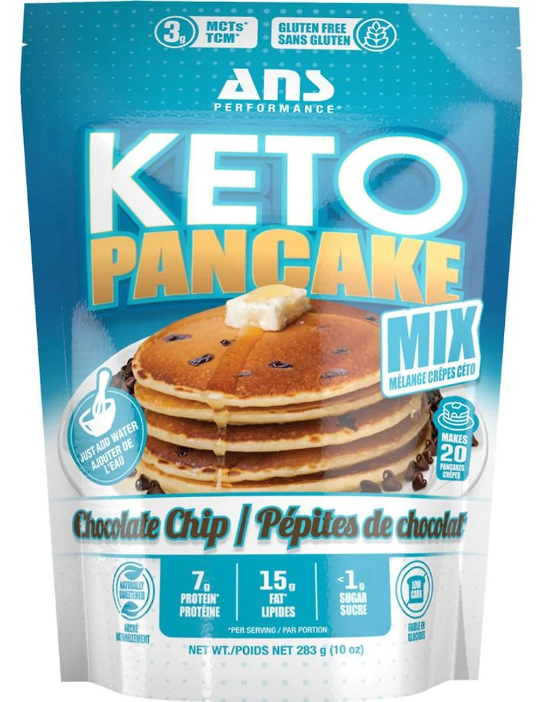 Perfectly balanced and so easy to make3g of healthy MCTs per serving from coconut oilZero added sugar, only 1g net carbs per servingGluten Free. Keto, Paleo & Vegetarian FriendlyEnjoy low-carb pancakes or waffles with an easy to make complete mixDescriptionANS Performance - Keto Pancake MixChocolate Chip - 283 283 gr Gram(s) - NPN: 0000000 -- Perfectly Balanced, All-Natural, Easy to Make KETO PANCAKE MIX 4 incredible flavors, naturally sweetened with stevia, 3g of healthy MCTs per serving from coconut oil, zero added sugar (1g of naturally occuring sugar from egg), All-Natural Formula, Gluten Free, Keto/Paleo & Vegetarian friendlyThe only complete Keto Pancake Mix on the market. Just add water, mix and make! Making keto lifestyles easier with this simple low carb keto-friendly product.INGREDIENTSNatural Almond Flour, Dried Whole Egg, Coconut Oil powder (Coconut Oil, Soluble Corn Fiber, Sodium Caseinate, Sunflower Lecithin, Silicon Dioxide), Sugar Free Chocolate Chips (maltitol, unsweetened chocolate, cocoa butter, lecithin, natural vanilla extract, whole milk powder), Sodium Bicarbonate, Natural Flavour, Stevia (leaf) extract, Sea Salt.