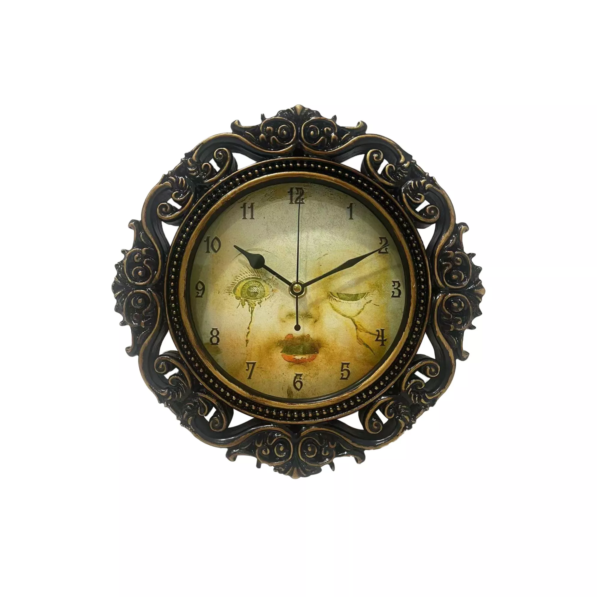 It's a dollhouse of horrors! Decorate your haunted house with this Antique Doll Face Clock.