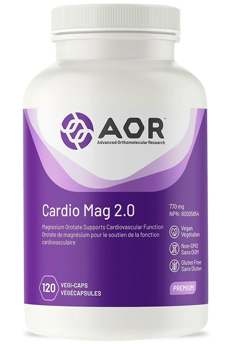AOR - Cardio Mag 2.0 - 120 Veggie Capsule(s) - NPN: 80005854Magnesium is a critical mineral, especially for cardiovascular health, and can offset inflammation, endothelial dysfunction, poor blood flow, atherosclerosis and high blood pressure. Furthermore, magnesium helps to regulate heart contractions and plays a central role in energy metabolism.Cardio Mag 2.0 provides magnesium orotate, a form of magnesium that is well absorbed and has been studied specifically for heart health. In addition to the magnesium, the orotic acid (orotate) has benefits of its own. It can penetrate cell membranes, enabling the effective delivery of the magnesium to the innermost layers of the cell. Orotic acid also increases the formation of RNA and DNA, which can help repair damage to heart cells, improve stress tolerance and therefore improve function. The combination of magnesium and orotic acid has been shown in clinical trials to reduce the frequency of abnormal heartbeats, improve heart failure, reduce symptoms of angina, and enhance exercise performance.AOR AdvantageAOR’s Cardio Mag 2.0 is designed to support heart health and to support normal blood pressure. It is a fully reacted, 100% pure magnesium orotate supplement. Cardio Mag 2.0 is a heart-specific form of magnesium that is clinically proven to improve the quality of life of those living with heart ailments and may help improve exercise capacity in both heart patients and athletes.INGREDIENTS