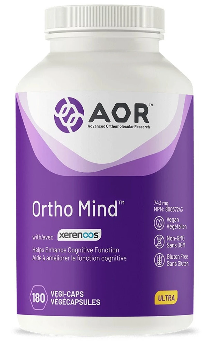 Provides nutrients that support focus, memory and energy supply to the brainMaintains brain structure and functionProtects the brain from damageIngredients backed by clinical researchDescriptionAOR - Ortho Mind - 180 Capsule(s) - NPN: 80037243 -- Ortho Mind is an advanced formula for cognitive health that contains synergistic ingredients in doses supported by clinical research. These include: R-lipoic acid, acetyl-L-carnitine, Citicoline, the Ayurvedic herb Bacopa monnieri, L-pyroglutamic acid and the Asian herb Panax ginseng.Ortho Mind is designed to support cognitive performance at any age, as well as to protect against age-related cognitive decline. R-lipoic acid and acetyl-L-carnitine work synergistically to support the function of mitochondria, where energy is produced. Since mitochondrial density is high in the brain due to its extensive energy requirements, this has the effect of increasing mental energy. R-lipoic acid is also a powerful antioxidant, protecting nerve cells from damage. Citicoline supports phospholipid and neurotransmitter synthesis, both of which support mood and brain cell function. Bacopa monnieri, an herb long revered in Ayurvedic tradition, has been shown to enhance cognitive function in both adults and children. Both bacopa and L-pyroglutamic acid have been shown to enhance learning, information processing and memory. Finally, all of the ingredients in Ortho Mind have been clinically studied not only in healthy subjects, but in patients with cognitive impairments, all with positive results.Ortho Mind is designed to optimize brain function in anyone from working professionals to students, aging adults who feel their mind isnt as good as it used to be, or those who require support in a state of cognitive decline.AOR AdvantageOrtho Mind is AORs principal cognitive function formula backed by clinical research. It is designed to help any brain perform better and to provide support against age-related cognitive deterioration.INGREDIENTS