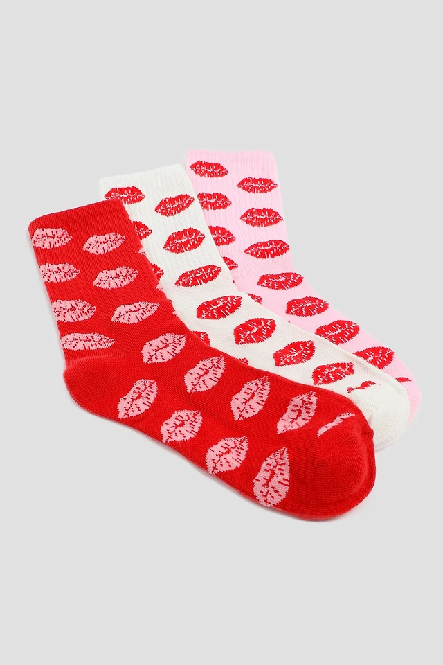 Ardene 3-Pack Kiss Crew Socks in Red | Polyester/Spandex