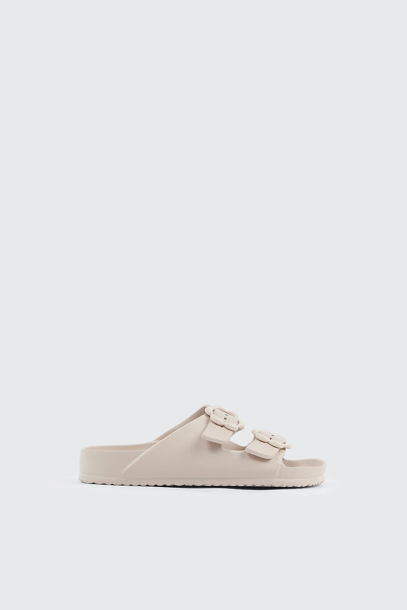 Exclusive piece from our Ardene KIDS collection. Two-Strap Slide Sandals for Kids. Pair them with shorts for casual look. Double strap Flat sole Adjustable straps Molded footbedMaterial & Care Upper: EVALining and outsole: EVA | Ardene Kids Two-Strap Slide Sandals in Beige | Size 11