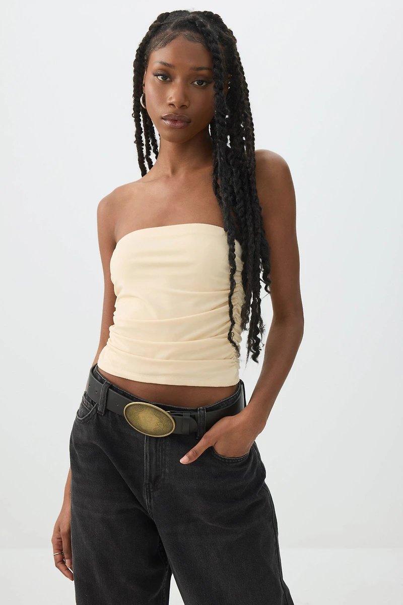Cropped tube top. Side ruching Cropped length Model is wearing size SComposition & Care 95% polyester, 5% elastane Turn garment inside out Machine wash in cold water in delicate Do not bleach Tumble dry low Iron on low setting if needed Do not dry-clean | Ardene Ruched Tube Top in Light Yellow | Size XS | Polyester/Elastane