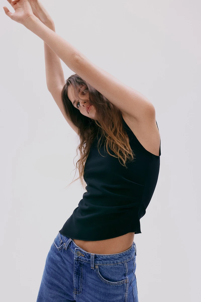 Fitted, sleeveless top in thick jersey. Round neckline, pleats at one side, and an asymmetric hem.